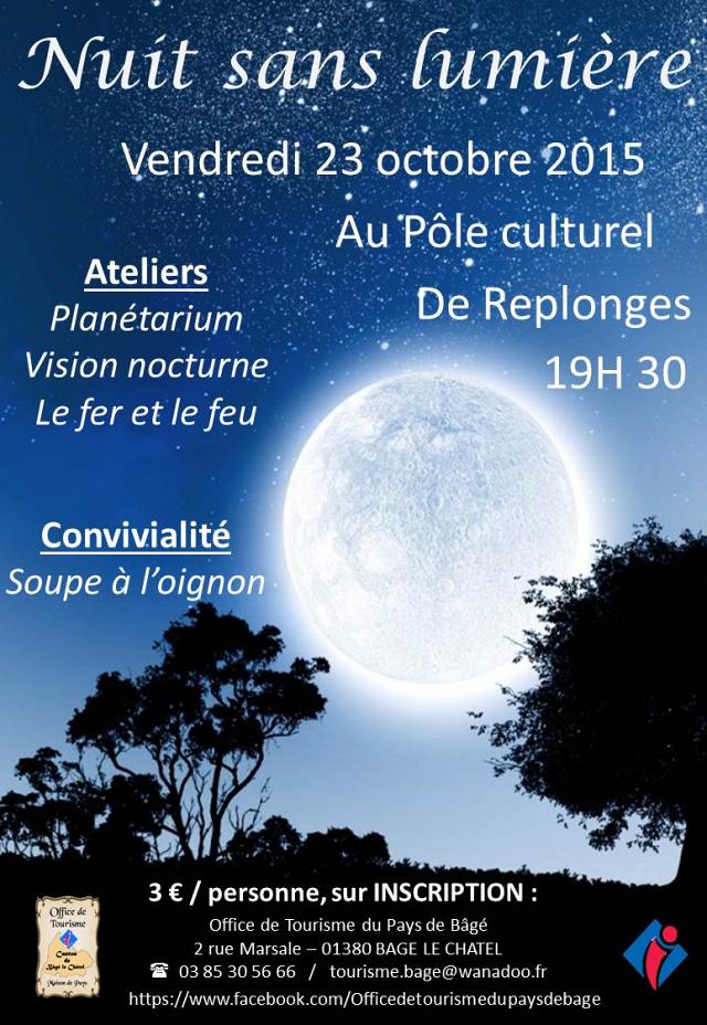 Le 23 octobre à partir de 19h30, quelques membres d’AstroSaône animeront un stand d’observation du Ciel d’Automne sur le parcours de la marche nocturne de la Nuit sans Lumière - organisée à Replonges par l’Office du Tourisme de Bagé.