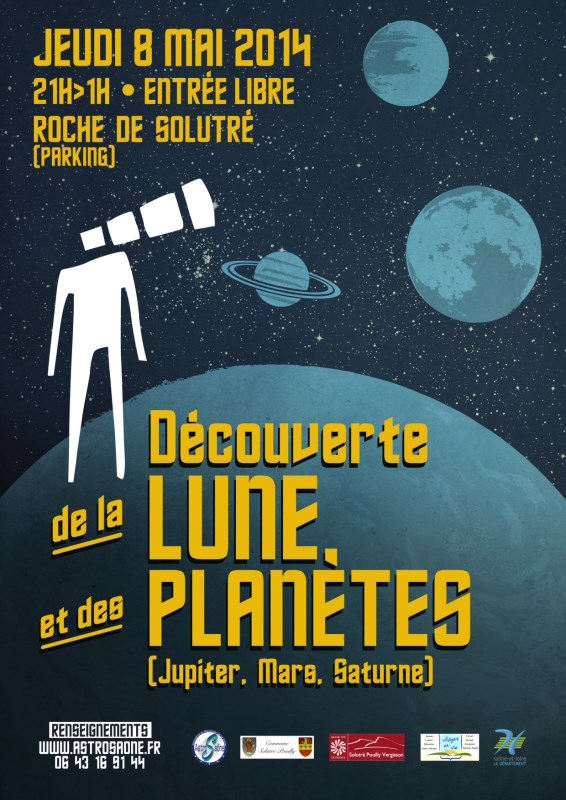 AstroSaône, Villages en Vie et le Grand Site de Solutré-Vergisson invitent le grand public à une découverte de la Lune et des planètes, le jeudi 8 mai 2014 à partir de21h, à Solutré au parking des Deux Roches.