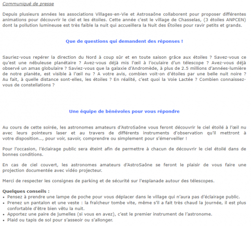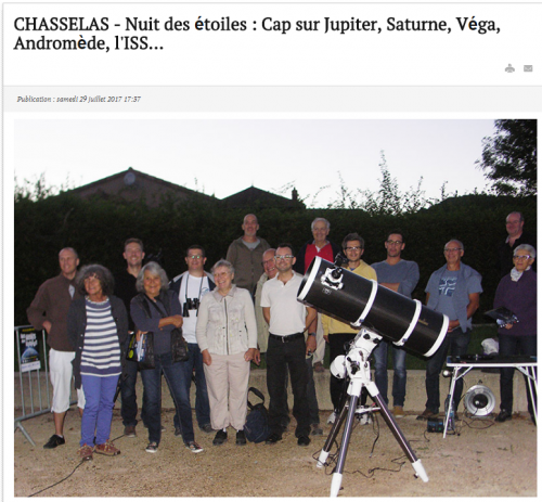 28/07/2017 Mâcon Infos : CHASSELAS : Pour cette Nuit des Etoiles, les astronomes amateurs d’AstroSaône vous feront découvrir le ciel étoilé