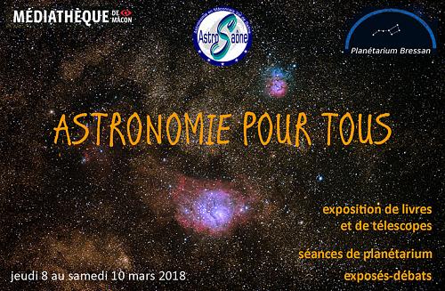 AstroSaône, le Planétarium Bressan et la Médiahèque de Mâcon organisent conjointement - du 8 au 10 mars 2018 - des journées ’Astronomie pour Tous’.