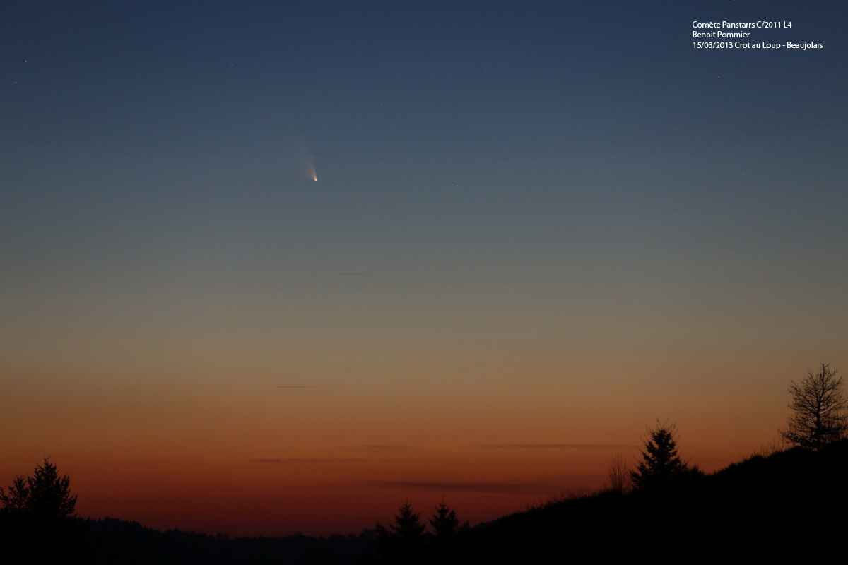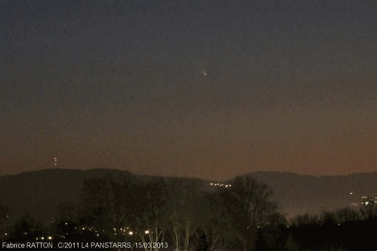 Cerise AVANT le gâteau !! C’est au tout début de notre séance d’observation du 15 mars 2013 au Crot au Loup que nous avons pu observer la comète C2011/L4 (Panstarrs), dans les lueurs du couchant.