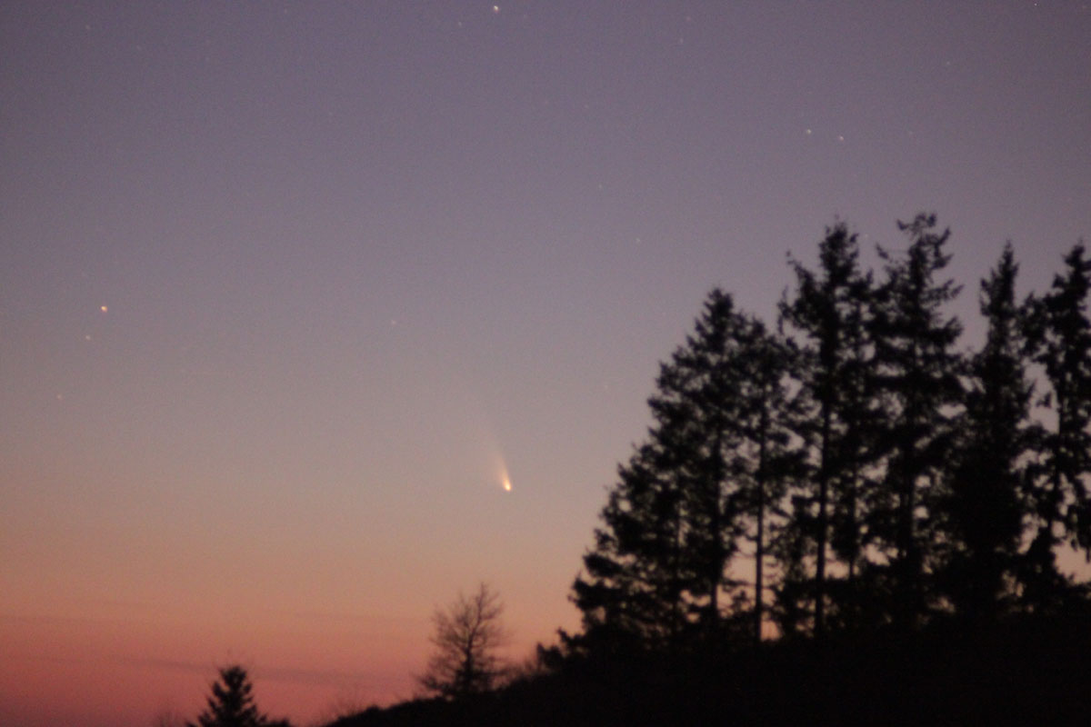 Et pourtant, c’était mal parti... vers 19h15 les lueurs du couchant nous masquaient les constellations - rendant le repérage de la comète assez difficile. Nous l’attendions beaucoup plus bas sur l’horizon. Alors que nous désespérions, Gérard - qui scrutait le ciel aux jumelles - a le premier détecté la comète.