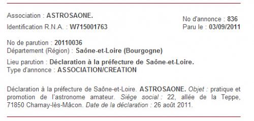 La création d’AstroSaône a été publiée au Journal Officiel le samedi 3 septembre 2011.