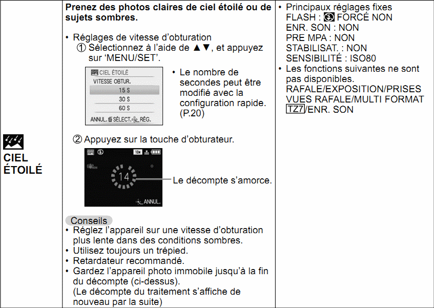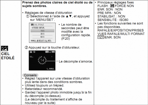 Comment faire : Commencer par chercher le mode Ciel étoilé (starry night) dans le manuel de votre APN.