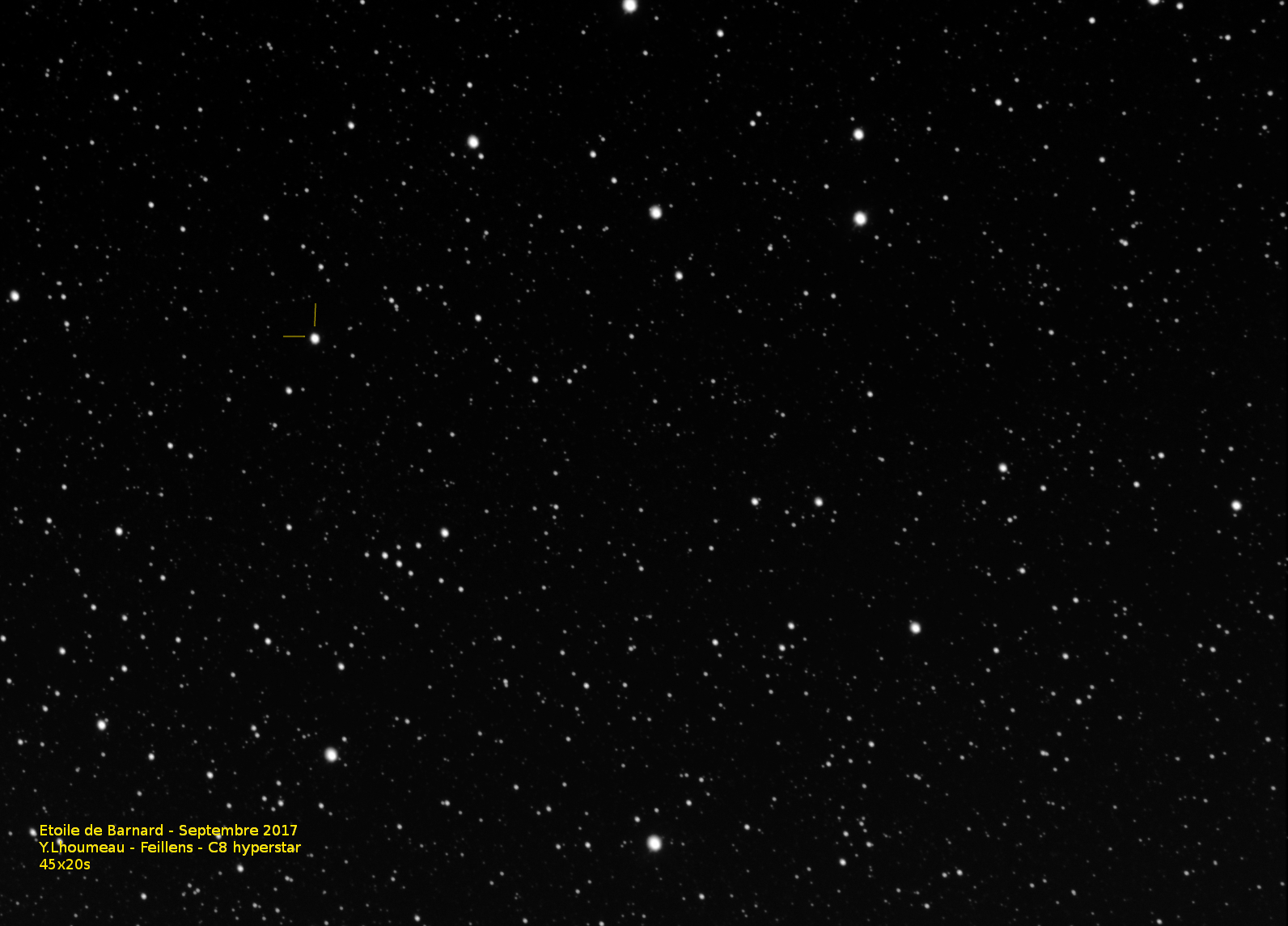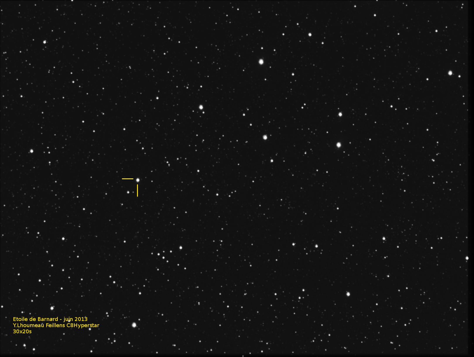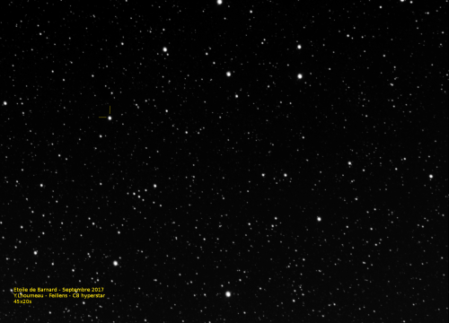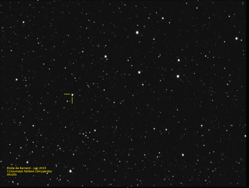 l’étoile de Barnard, petite naine rouge de magnitude 9,5 (invisible à l’oeil nu) est situé dans la constellation d’Ophiucus, le serpentaire (cf ciel d’été) et est connue pour être la "plus rapide du ciel". Son déplacement apparement est estimé à 10,3’’ (sec d’arc)
